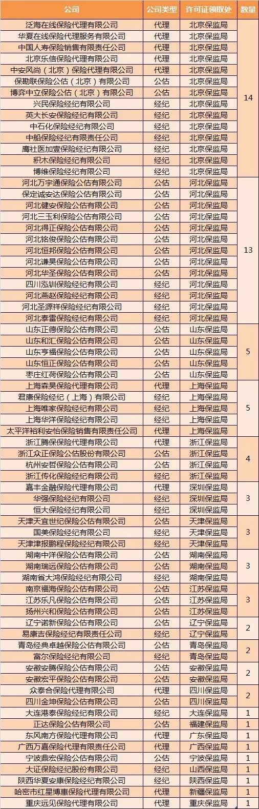 根据保监会公开资料统计,2016年,中国保险市场共有70家保险专业中介获批,其中公估31家,经纪公司25家,代理公司14家。根据最新监管要求,保险经纪公司、代理公司注册资本均上升到5000万元。
