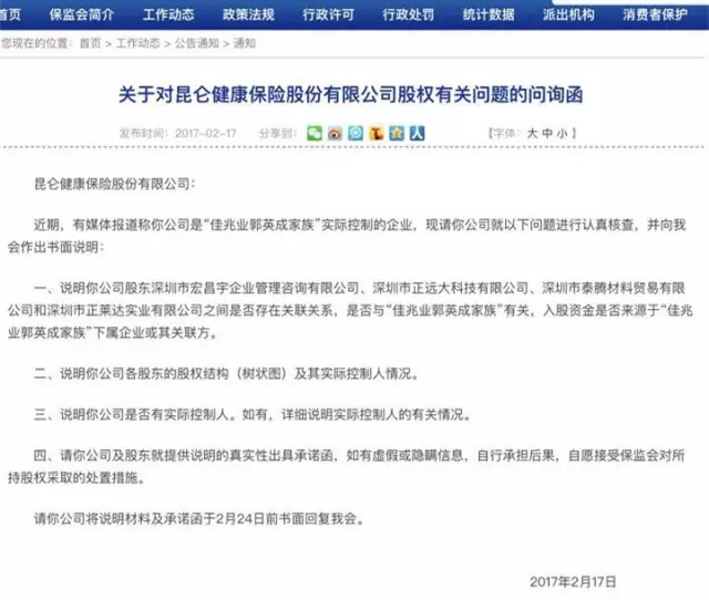 昨日,某自媒体发表原创文章称昆仑健康系“佳兆业郭英成家族”实际控制的企业,在保险圈内引发轩然大波。17日晚间,保监会首开质询先河,在官网直接发布针对昆仑健康的问询函,询问其是否如文中所言为“佳兆业郭英成家族”实际控制的企业。