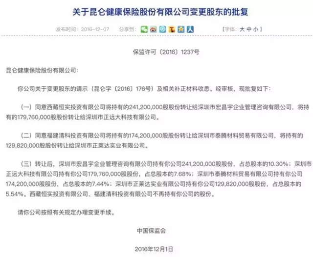 2016年12月7日,保监会发布《关于昆仑健康保险股份有限公司变更股东的批复》,同意其变更股东。