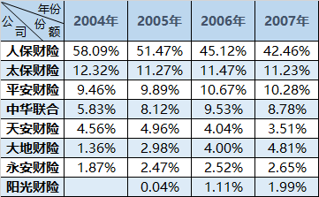 当时的弄潮儿是中华联合、天安财险和开业不久的大地财险。尤其是中华联合,市场份额一度逼近平安产险,接近10个百分点,9.5%;而天安财险和大地财险均接近5个百分点,4.96%和4.8%;那时亏损一塌糊涂的永安也有着2.5个百分点的市场份额,开业不久的阳光财险也依托早年股东资源,拿下2个百分点的市场份额。
