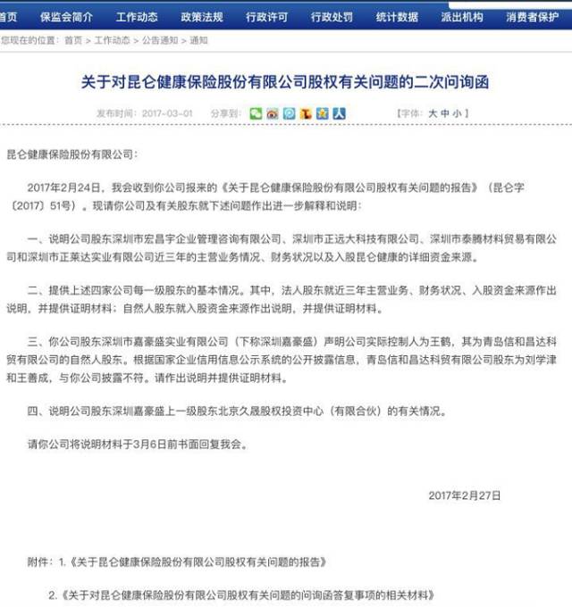 对于昆仑健康的回答,保监会明显并不满意,发出二次问询函,要求四家股东进一步交代各自的主营业务情况、财务状况以及入股昆仑健康的详细资金来源。