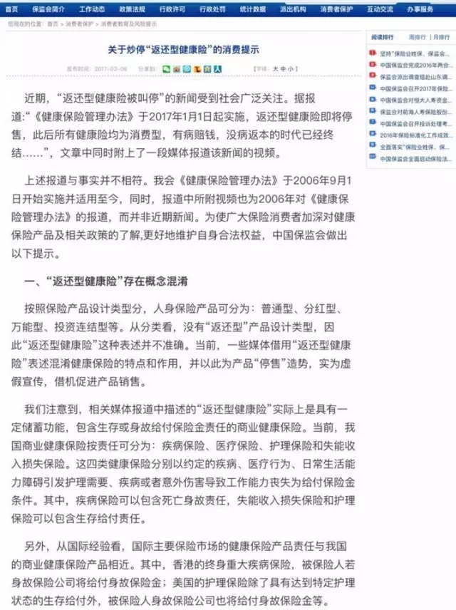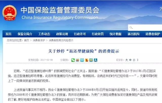 该谣言流传之广,影响之大,以至于保监会都不得不出来“辟谣”了。3月6日,保监会发布《关于炒停“返还型健康险”的消费提示》,明确表示,这是谣言!除此之外,保监会还对“返还型健康险”的概念进行了厘清:按照保险产品设计类型分,人身保险产品可分为:普通型、分红型、万能型、投资连结型等。从分类看,没有“返还型”产品设计类型,因此“返还型健康险”这种表述并不准确。当前,一些媒体借用“返还型健康险”表述混淆健康保险的特点和作用,并以此为产品“停售”造势,实为虚假宣传,借机促进产品销售。
