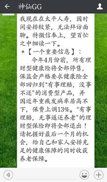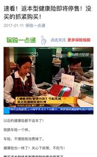 谣言:2016年末,2017年初,一则“返本型健康险即将停售”的消息在保险圈刷了屏。消息称,保监会全面叫停中国境内所有返还型健康险,此后所有健康类、重疾类保险产品都将为消费型,然后号召消费者抓紧时间购买……消息图文并茂,还附加一段央视新闻视频,以佐证消息的准确度。
