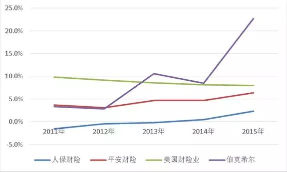 国内两大财险巨头的投资收益与保费收入的比值明显低于美国财险业平均水平,而伯克希尔由于权益投资较高,受到金融危机影响,在2011和2012年该指标较低,但2013年之后迅速拉升到10%左右的水平,2015年更是高达22.7%。