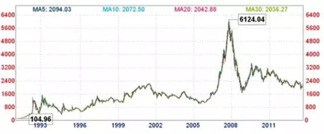1991年以来上证综合指数走势图(转载自和讯网),和美国道琼斯指数的一路向上形成鲜明对比