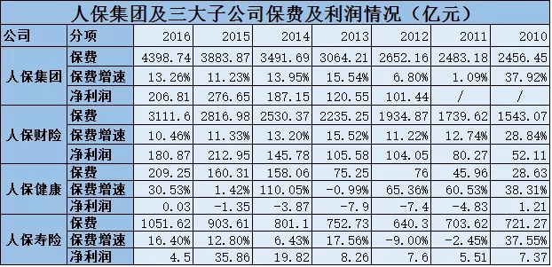 下面是一段残酷且尴尬的数据:2010年——2016年人保财险的净利润分别为52.11亿元、80.27亿元、104.05亿元、105.58亿元、145.78亿元、212.95亿元、180.87亿元,同期人保集团净利润分别为206.81亿元、276.65亿元、187.15亿元、120.55亿元、101.44亿元(2010、2011年没有披露),人保寿险的净利润分别为7.37亿元、5.51亿元、7.6亿元、8.26亿元、19.82亿元、35.86亿元、4.5亿元,人保健康的净利润分别为1.21亿元、-4.83亿元、-7.4亿元、-7.9亿元、-3.87亿元、-1.35亿元、0.03亿元。