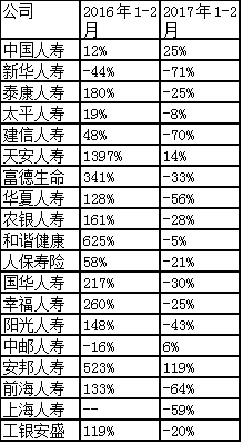 2016、2017年1-2月部分公司银保渠道规模保费增速