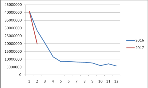 2016各月及2017前两月寿险银保规模保费对比图(万)