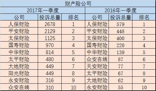相比人身险公司,财产险2017年第一季度投诉总量排名前十公司中,前五名与去年同期相同,未发生变化。阳光财险以449件投诉量进入前十。