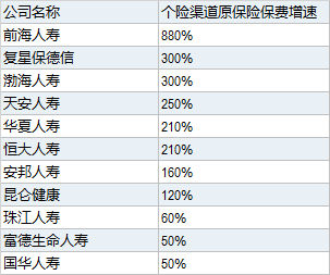 从『慧保天下』获得的一份同业交流数据来看,多家险企个险渠道原保险保费增速都达到了100%以上,前海人寿以800%以上的增速居于榜首,复星保德信人寿、渤海人寿、天安人寿、华夏人寿以及恒大人寿的个险渠道原保险保费增速也都达到了200%以上。