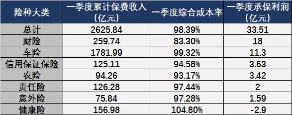 虽然保费增速低迷,但财险的综合成本率却是所有险种当中综合成本率最低的,一季度,这一数据仅为83.30%,其中,综合赔付率44.60%,综合费用率38.70%。