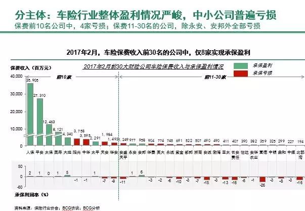 从市场主体的角度来看,车险行业整体盈利情况也非常严峻,中小公司普遍亏损。2017年前两个月,保费收入排名前10的财产险公司当中,有4家公司出现了承保亏损。而排名在11—30之间的20家险企中,只有永安保险以及安邦财险实现了盈利,其余均为亏损。