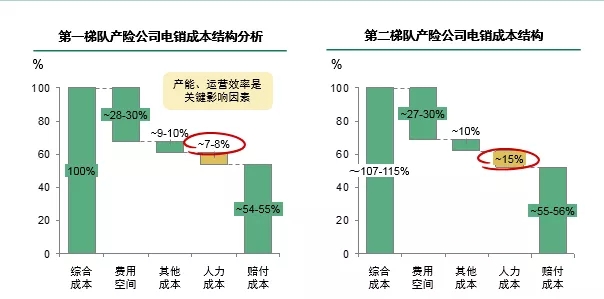 若主要险企愿意守住盈亏平衡点,市场费用投放预计已经达到了“天花板”,而精益运营带来的人力成本优势成为生存关键。如下图所示,第一梯队险企与第二梯队险企在成本中的主要差异就体现在人力方面。