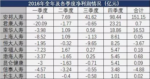 典型者如君康人寿,2016年前三季度产生22.5亿巨额亏损的情况下,在第四季度实现了23.2亿元的净利润,全年盈利0.7亿元。