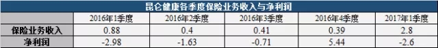 昆仑健康2016年前三季度持续亏损,累计5.32亿元,第四季度突然盈利5.44亿元。实现全年净利润0.12亿元。2017年一季度保费收入2.8亿,较上季度末大幅增加,却再度亏损2.6亿元。
