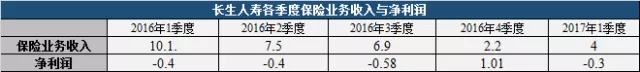 长生人寿2016年一季度保费收入10亿,但未能扭转亏损0.4亿元的局面,然而随着后三季度保费一路递减,却在第四季仅靠2.2亿保费收入,实现扭亏为赢,净利润达1亿元。