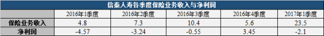 然而,2017年第一季度保费收入高达23.5亿元,同比增长390%。净利润却依然亏损达2.1亿元。