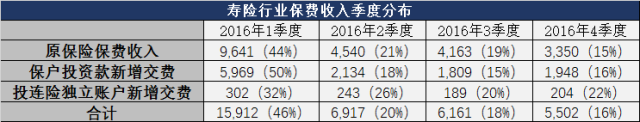 如上表所示,2016年寿险业1季度原保险保费收入占全年的44%,所有业务收入占全年的46%,后续收入逐季递减。