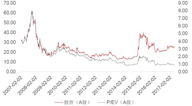 下面的4张图中,较浅的一条线是4家A股上市险企的内含价值倍数历史走势,代表了公司的估值水平。可以看出,目前的估值仅与历史最低位持平,中国平安、中国太保、新华保险、中国人寿的内含价值倍数仅为0.94倍、0.85倍、0.92倍、0.97倍,就算上涨10%,也仅是保本大甩卖。