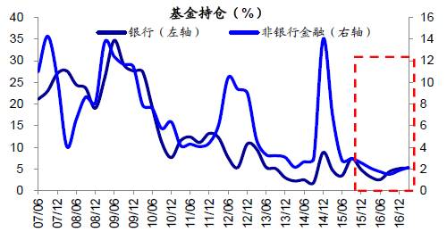 再次,投资者持仓较低。持仓低,意味着不大可能再接别人的盘。从下图我们可以看到,银行与非银行金融(包含保险、证券、信托)行业,从基金的持仓比例数据来看,都是处于历史的低位,基金对非银行金融行业的持有仓位仅是2%左右,离2014、2015年持仓高点的35%可算是云泥之别。至于为什么保险股涨而券商股不涨,那又是另一个话题了。