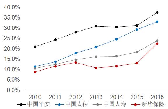 衡量保险公司利润率的工具是新业务价值率,从下图中4家上市险企年报公布的新业务价值率走势可以看到,盈利能力是在一个持续上涨的阶段。