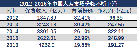 在国寿集团的版图中,寿险公司是绝对的主业,头顶“老大”光环,独步江湖多年,但即便如此,在一波又一波的扩容潮中,其市场份额亦难逃被蚕食的命运。2012年8月,杨明生赴任国寿集团董事长后的首个业绩发布会上,其还坚定表示寿险主业要“三分天下有其一”,但5年过去,其原保险保费市场份额已经从2012年的32.41%逐步下滑至2016年的19.85%。