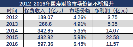 衔玉而生的国寿财险继承了中国人寿的资源禀赋,生而不凡,而其志向也注定不是普通的财产险公司可比。成立11年有余,借助中国人寿丰厚的人才储备、庞大的销售网络,国寿财险始终保持了高速发展态势,迅速成长为国内第四大险企。截至2016年末,其市场份额已达6.45%,大有赶超财险老三太保产险之势。