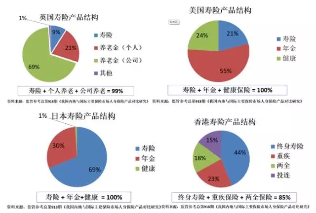 不过值得注意的是,各国对于人身险产品的分类标准不尽相同。例如在美国以及英国,虽然主要的产品类型就是寿险、健康险、年金险、养老险等,但其中仍包含有大量的兼具保障与理财功能的投资连结保险、万能险、变额年金等。