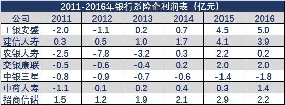 保险资金投资收益最好的2015年,银行系保险公司盈利出现大幅增长,工银安盛、建信人寿、中邮人寿、招商信诺净利润分别达到4.5亿元、4.1亿元、3.5亿元、2.9亿元,同比增长为537%、140%、1440%、36%,加上农银人寿、交银康联、中银三星、中荷人寿等另外四家银行系险企,2015年合计实现净利润18.1亿元。2016年,投资收益明显下滑的背景下,上述八家银行系寿险公司依旧实现了15.3亿元的合计净利润。