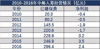 2014年后的中邮人寿明显放慢脚步。2015已赚保费247亿元,同比增幅12%;2016年已赚保费296亿元,同比增幅20%。同期,中国寿险的保费增速分别为25%和37%。