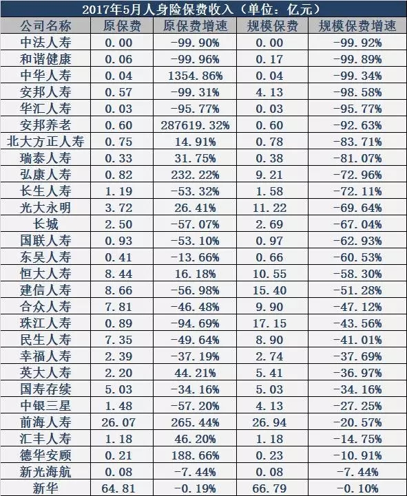至于安邦系三家寿险公司,依旧负增长,依旧都在九成以上。安邦养老、安邦人寿、和谐健康分别负增长92.63%、98.58%、99.89%,整个5月保费收入4.9亿元,2016年同期为450亿元。