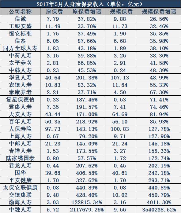 2016年因被罚一度暂停业务的中融人寿,和基数过小的渤海人寿蝉联了5月单月保费增速第一名和第二名。近10亿元规模保费,令中融人寿5月单月保费增速达到3540238.52%,渤海人寿则以3.16亿元的规模保费,实现了4011.30%的同比增速。