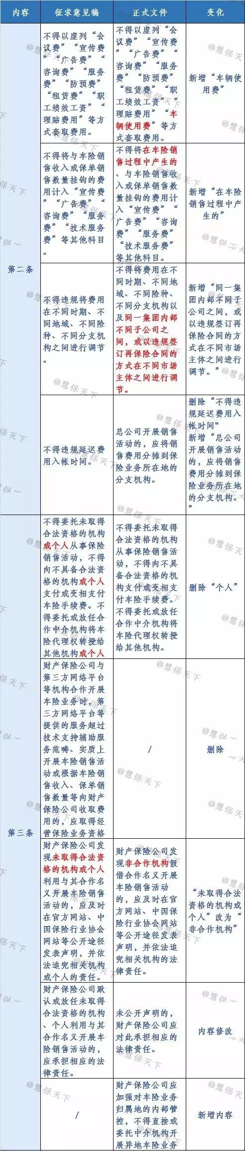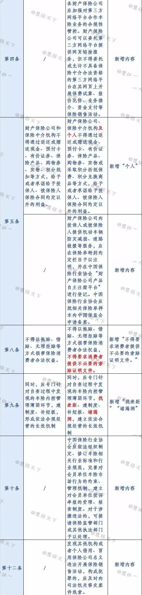 相比六月初的征求意见稿,增加十多处改动,其中最大的改动就是增设了两条规定。正式文件中共有12条规定,征求意见稿为10条。从具体修改的内容来看是新增较多,删改少。车险相关人士对『慧保天下』表示,正式文件相对意见稿更加严格,弥补了最初一版的漏洞。