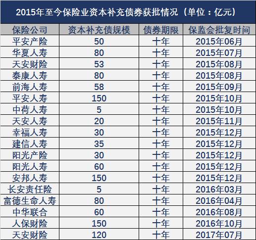 从时间段看(以保监会批文日期为准),2015年放开资本补充债后,有13家保险公司获批(3家财险公司、10家人身险公司),累计发债规模801亿元;2016年规模大幅减少,仅有4家保险公司(1家人身险公司、3家财产险公司)获批发债295亿元。而2017年至今,只有天安财险一家产险公司获得了相关部门的批准。
