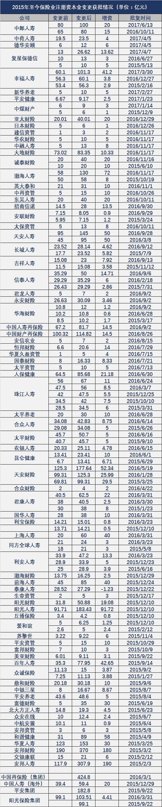 除保监会已批准的公司外,人保资管于2017年5月25日发布了增资报告,拟将4.98亿未分配利润转增注册资本金;此外,平安健康拟增资6亿元;长城人寿拟增资50亿元——这将是长城人寿成立以来金额最大的一次增资;浙商财险、中法人寿分别拟增资15、13亿元。