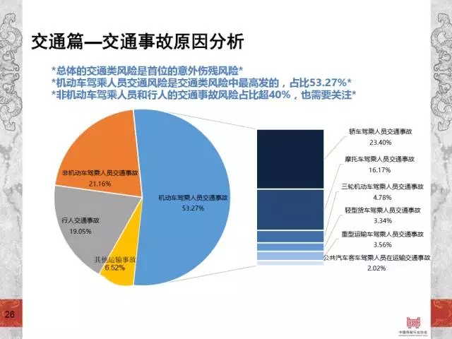 《报告》特意对交通事故原因进行了分析,机动车驾乘人员交通事故占比超过一半,进一步分析,轿车、摩托、三轮车驾乘人员事故风险最高。