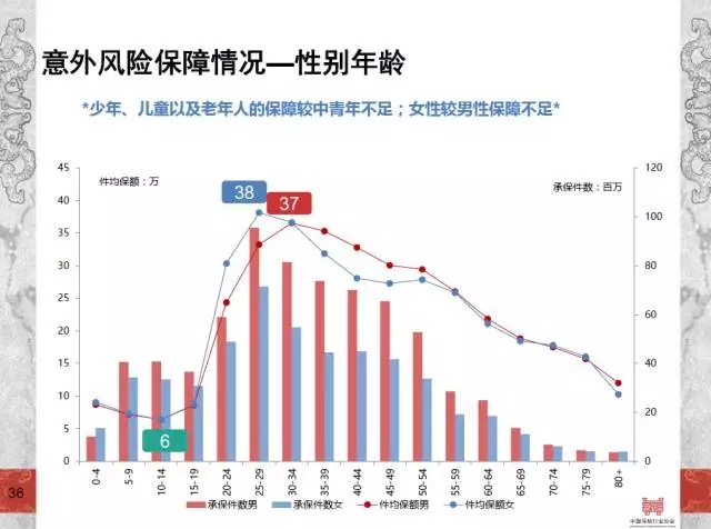 从图上看出,保障人群分化比较明显。老年人的意外风险保障比较欠缺,青少年也不足。风险越高的年龄反而保障程度最低,值得关注。