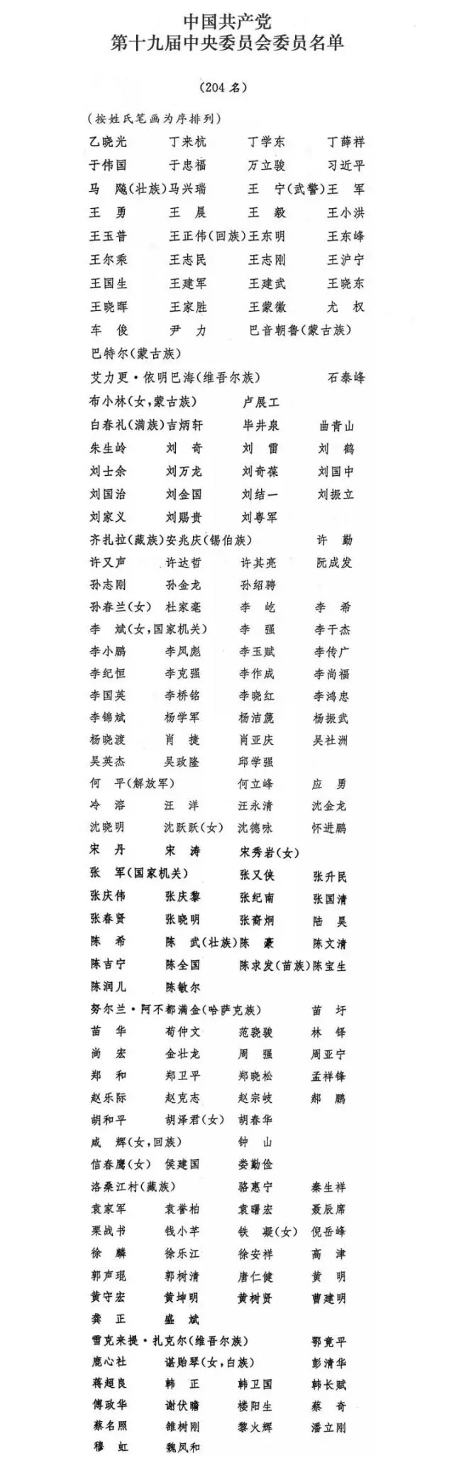 大会应到代表和特邀代表2354人,实到2336人。在总监票人和监票人监督下,到会的代表和特邀代表以无记名投票方式,选举出由204名委员、172名候补委员组成的十九届中央委员会,选举出十九届中央纪律检查委员会委员133名。(详细名单请见文尾)