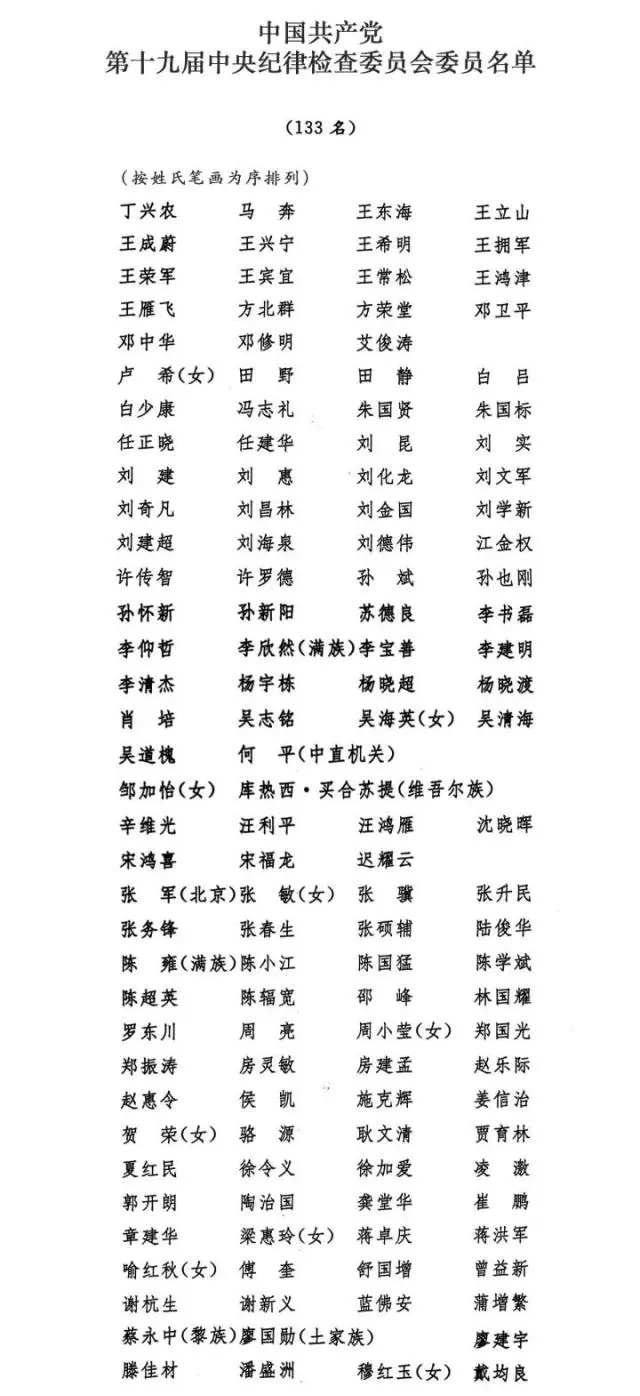 133名十九届中央纪律检查委员会委员中,中央纪委秘书长杨晓超、央行纪检组组长王鸿津、银监会纪检组组长李欣然、保监会纪检组组长林国耀都在其中,而证监会纪检组组长王会民未出现在名单上。