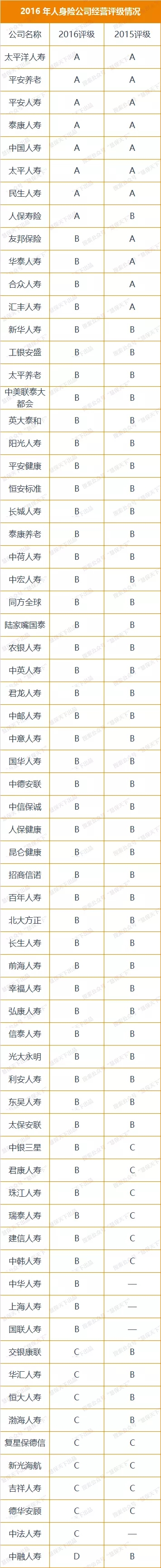国寿、太保寿险、平安寿险、泰康人寿、太平人寿五家大型公司评价为A,人保寿险、民生人寿和平安养老亦在列;新光海航人寿、交银康联、渤海人寿等八家小型险企评价为C级,经营存在一定问题。