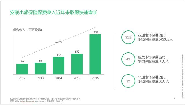 据悉,2010年,全球小额保险的客户总数约为7600万,至2013年已发展到了2.6亿。劳合社曾估计全球潜在市场总量为15亿到30亿保单。