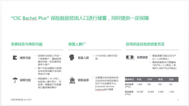 以安联2015 年在印度推出的小额储蓄型人身险“CSC Savings Plus”为例,该险种主要为14-55 岁的贫困人口设计,通过由政府设立的服务于偏远和农村地区的基本服务中心进行销售。
