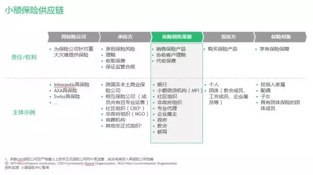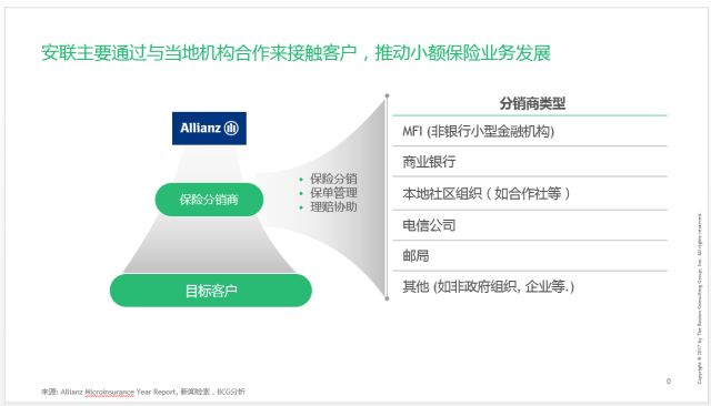 以安联为例,截止2016年底,其通过与超过700多家的小额信贷机构、商业银行、社区组织、电信运营商、邮局及非政府组织等机构合作,建立广泛的销售网络。合作机构除了分销外,也提供部分保单管理及理赔服务的职能。