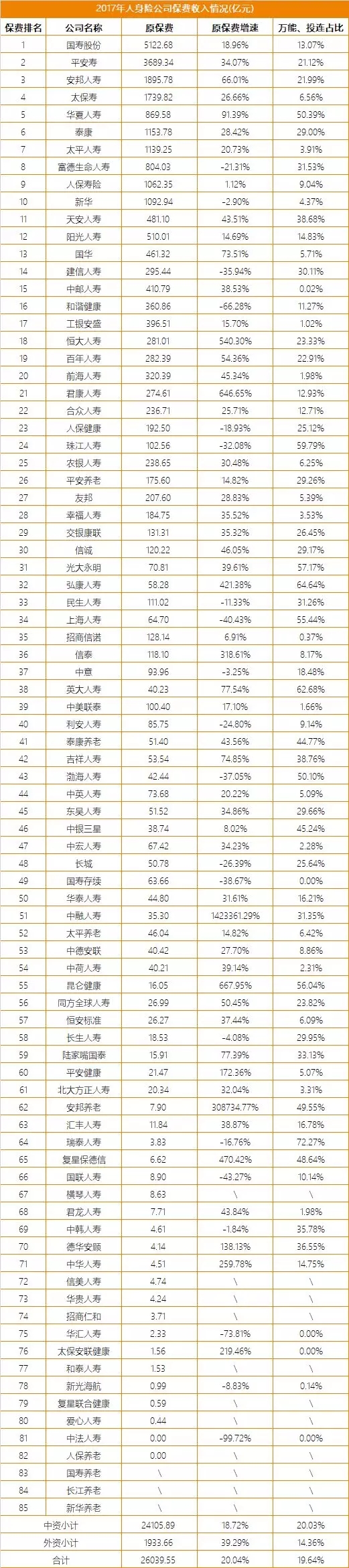 3月6日,保监会官网公示了2017年度各保险公司保费收入情况,寿险公司原保费收入近26040亿元,同比增长20%。 其中健康险业务原保费收入超4389亿元,同比增长8.58%,意外险业务原保费收入901亿元,同比增长超20%。