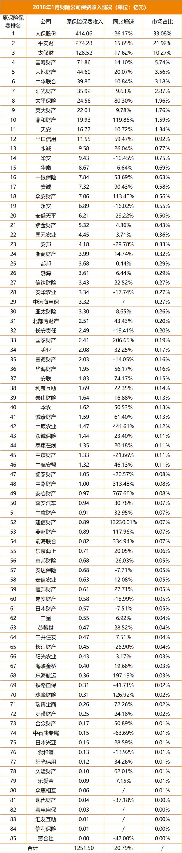 3月9日,保监会官网公示了2018年1月各保险公司保费收入情况。保险业1月原保险保费收入6851.92亿元,同比下降19.89%。其中,产险公司原保费收入1251.50亿元,同比增长20.79%。其中,交强险原保费收入189.52亿元,同比增长11.10%,农险原保费收入为47.24亿元,同比增长51.79%。