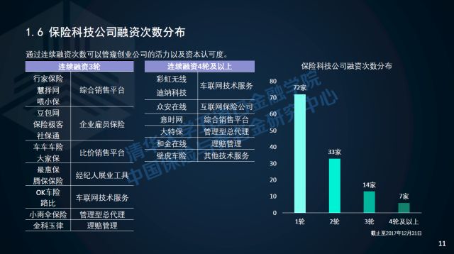 同时,保险科技融资次数也出现了明显增加。截至2017年12月31日,保险科技公司融资次数1轮达72家,2轮达33家,3轮有14家;有7家公司获得了4轮以上融资。
