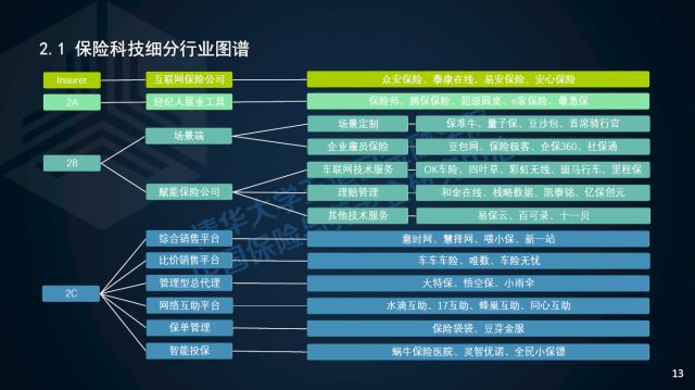 根据创业公司主营业务和发展方向,PBCSF将目前的保险科技公司分为Insurer、2A、2B、2C四大类13个细分方向,并分别对每个细分方向企业融资情况进行了介绍。