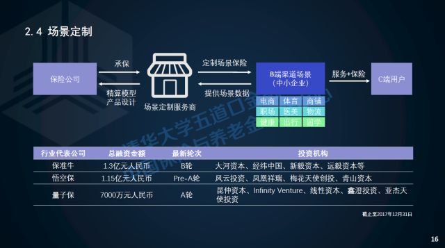 2C企业中,近年来兴起的场景定制服务商通过与保险公司合作,根据不同的场景直接为客户设计合适的产品。不难看出,这一模式下企业获得融资额不算太低,悟空保仅在Pre-A轮便获得了上亿元投资。