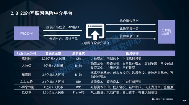 PBCSF展示了近年来融资金额最多的前20家公司,发现除独角兽众安外,2C类保险中介平台更能获得资本认可。如大特保、慧择网、车车科技等累计获得上亿元融资。
