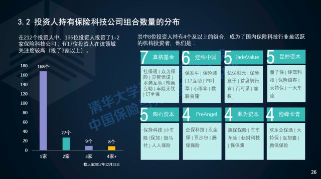 PBCSF发现,在212个投资人中,大部分投资了1-2家保险科技公司;有17位投资人投了3家以上。其中,真格基金、经纬中国、JadeValue、昆仲资本、陶石资本、PreAngel、顺为资本、险峰长青8位投资人持有4个以上的组合。